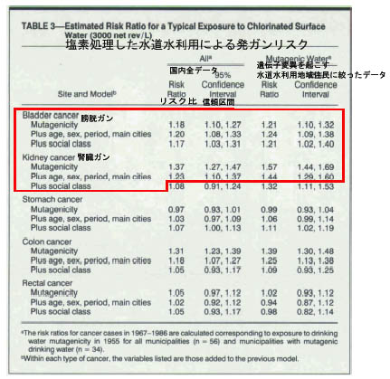 水道水を殺菌するのに、塩素化合物が使われています。それによって、水道水を介して伝染する病気がほとんどなくなりましたが、水道水を塩素処理すると様々な化学反応が起こり、トリハロメタン等、生物に有害な物質(例えば、遺伝子に悪影響を与える)ができてしまいます。この論文は、1967〜1986年のフィンランドで過去の水道水の塩素処理履歴とガン診断データを参考にして、塩素処理した水道水を利用している人々の間で、利用しない人に比べて、膀胱ガン、腎臓ガンの発ガン率が高いことを示した論文です。 解説