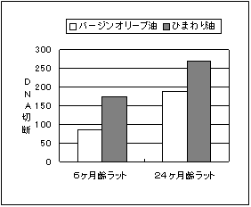 バージンオリーブオイル(オレイン酸が多い)、ひまわり油(リノール酸が多い)の2種で比較した。 ひまわり油の方が、オリーブ油よりDNA切断が多かった。同様の研究がミトコンドリアでも行われ、同じ様な結論になりました。 |