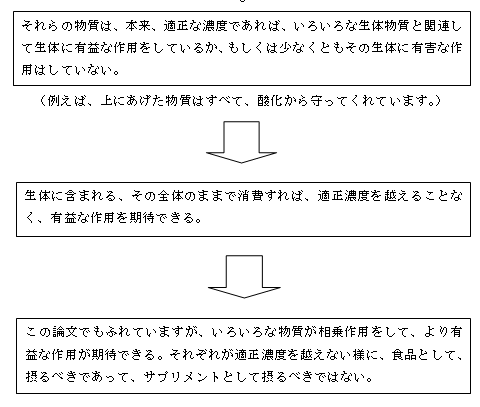 栄養と健康をよくするためには、消費者は、サプリメントではなく、抗酸化物質を多く含む食事をすべきです。さらに重要なことは、幅広い食材を摂ることは、いろいろな植物由来化学物質を摂ることになり、その毒性につながるまで摂取することにならないからです。(植物由来化学物質は摂りすぎると毒性を持つ)果物や野菜を多く含む食事の利点は、いろいろな種類の植物由来化学物質がミックスされている、ところにあります。このことが、単独のサプリメントでは、効果がないことの説明の一部になります。