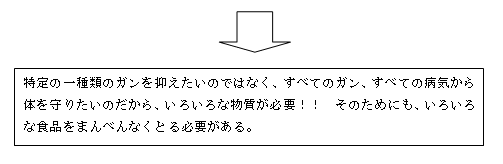 彼らの結論は、ガンの予防は、多くの種類のフルーツと野菜を摂っている人で最もよく、1つの種類の野菜や果物ばかり摂っている人は、特定のガンが増える傾向がありました。