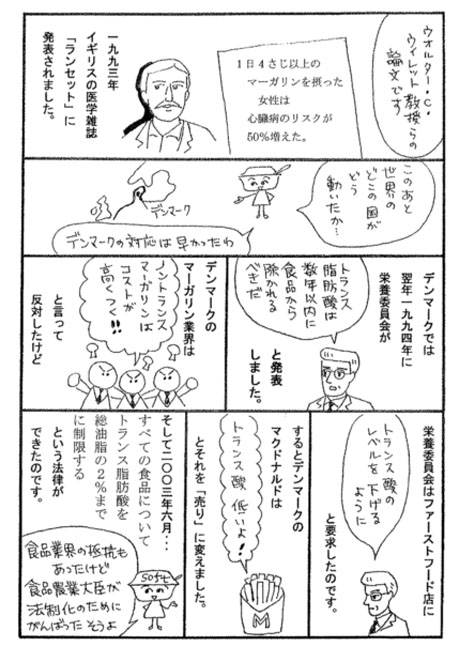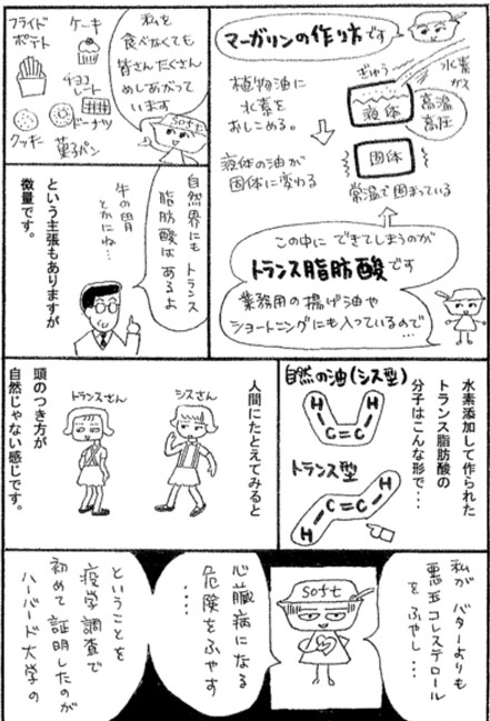 最近、某ドーナツ会社でもCMで取り上げられている「トランス脂肪酸」。名古屋生活クラブでは14年も前から、その危険性を訴えています。今回皆さんに実態をもっと知って欲しく分かりやすくマンガにしました。 何気なく食べているファストフード、スナック菓子、どれも身近にある物ばかりです。選択するお母さん、一人一人が心がければ某ドーナツ会社が動いたように、日本全体の意識も変わってくるような気がします。