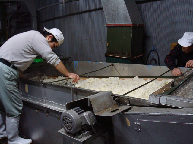 上原酒造にある天秤しぼりのしぼり機は写真でその姿を見ていましたが、実物の大きさは迫力がありました。1トンもの重さでじっくりと、袋に入ったモロミから酒をしぼり出すのです。 一般の機械しぼりが18時間で済むところを天秤で3日間かけてしぼるという一見、非効率的なやり方ですが、一般的な機械しぼりのようにモロミをしぼりきってしまわないので酒に雑味が混ざらず、旨みにあふれた酒になるのです。 上原酒造でもかつては機械しぼりをしていたこともありましたが、おいしい酒を造りたいという思いから天秤しぼりに戻したのです。 杜氏の山根さんがしている酒作りは「米の味を酒に残したい、そういう酒作りをしたい。香りの主張はない酒になるが香りがあると食中酒にむかないから」…この言葉を聞いて、上原酒造の酒の魅力の一端を知りました。この杜氏さんのもとで作られるから深い味わいのある酒ができるんだと、実感しました。 (丑山) |