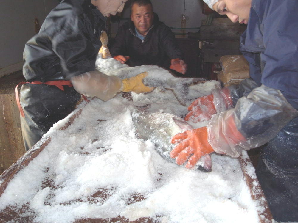生産者名:山三商店 生産地:北海道 主な生産物:海鮮加工物など 先日、山三商店に伺いました。見事なまでの職人の技を紹介します。 秋鮭の山漬けの仕込〜 腸を取り除いた5kg以上の大きなオス鮭に塩をたっぷりすり込ませる。どこもまんべんなく塩で埋め尽くされるように、うろこに逆らって塩をすり込む。 1尾1尾を並べて上に上にと積み重ねていく。山盛り。だから「山」漬けという。 1週間ほど寝かせたら塩を取り除き冷凍庫で出荷まで保存する。 冷凍庫に入れる前の山漬けをスライスして見せてもらった。 見事にきれいな艶やかな朱色の身。 驚くことに「ほんのり甘い」身。 今、山漬けの製法をしているのはここぐらいだろうとのことだった。 職人の手で作られる芸術的とまで思う山漬けが日本から消えていくと思うと残念でならなかった。 ザ・職人の山内さん。残念なことに後継者がいない。 今回色々話を聞くことが出来たが、どれも職人の技と勘によるものだ。 だから簡単に誰かが代わりに作ることもできない。 本物を作るということは手間がかかるもので経験がものを言わせるものだと改めて思った。 |